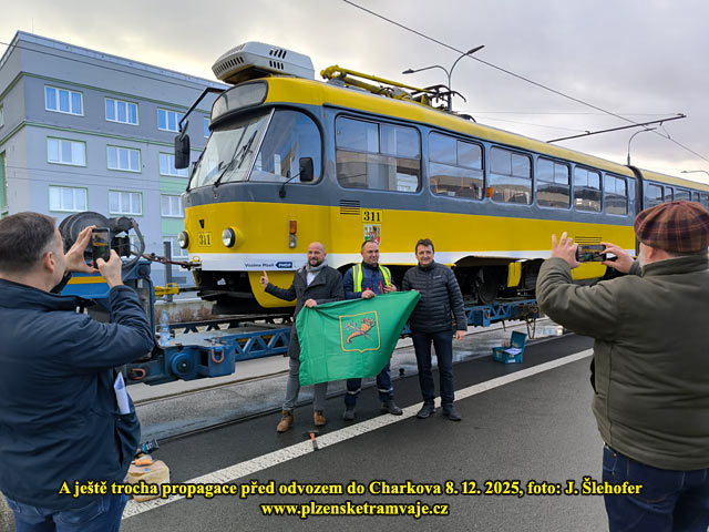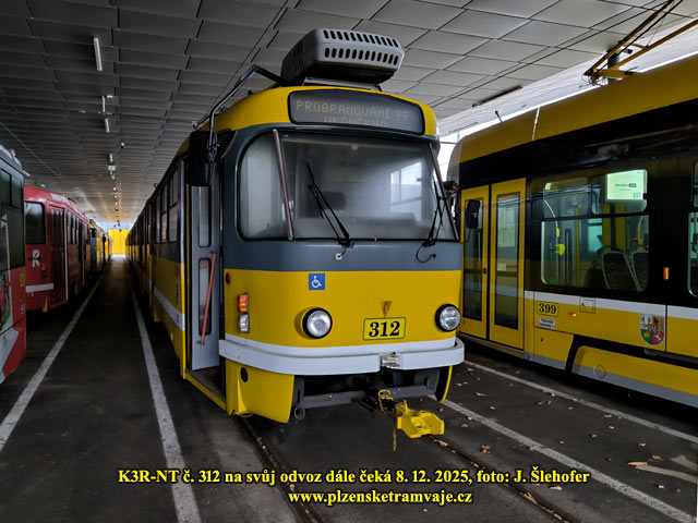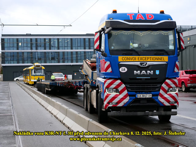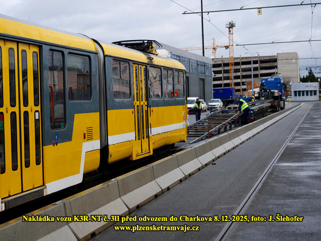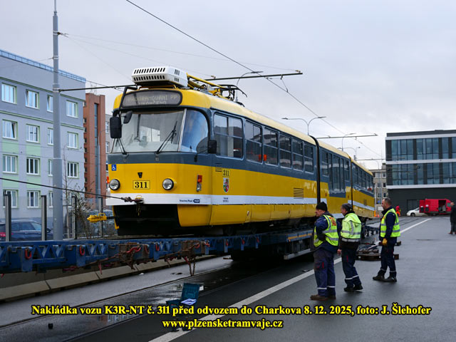 V pondělí 8. 12. 2025 dopoledne probíhala ve vozovně na Slovanech nakládka tramvaje K3R-NT č. 311, která opustí Plzeň a zamíří do Charkova. Pro vůz si přijel ukrajinský dopravce s dlouhým podvalníkem. Po složení rampy byl vůz odbržděn a pomocí navijáku vytažen na podvalník. Další tři vozy K3R-NT jej budou následovat, ale nelze ani odhadnout kdy, může to být i v řádu týdnů. Plzeň pak náklad opustil ve večerních hodinách.