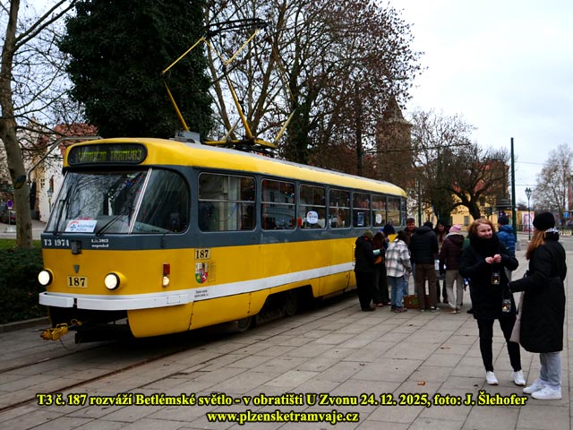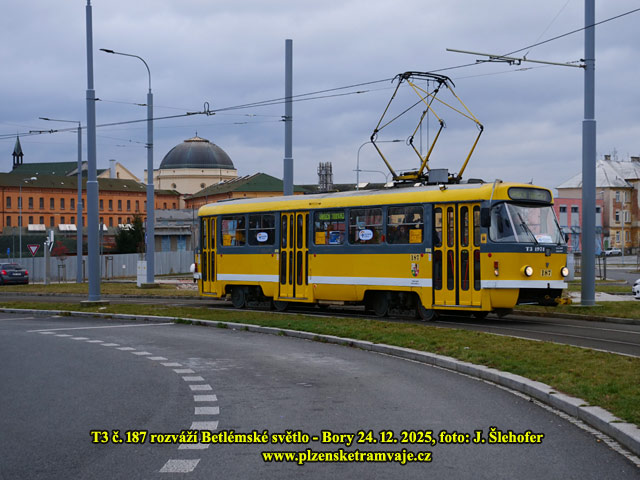 Letos poprvé vypravili skauti ve spolupráci s PMDP tramvaj pro rozvoz Betlémského světla. Dle předem zveřejněného jízdního řádu objížděla 24. 12. 2025 vybraná obratiště, kam si pro plamínek z Betléma mohli zájemci přijít. Vypraven byl historický vůz T3 č. 187, který je zachován ve stavu tak, jak dojezdil v roce 2012.