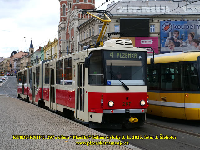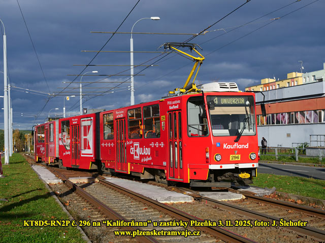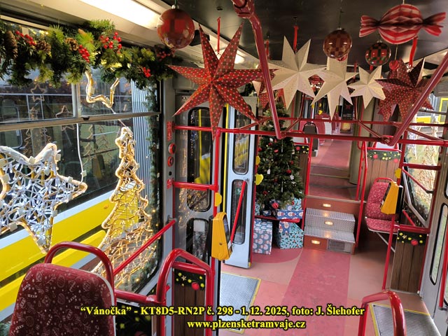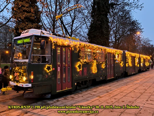 KT8D5-RN2P č. 298 jako Vánočka 30. 11. 2025 KT8D5-RN2P č. 298 jako Vánočka 30. 11. 2025 Letošní "Vánočka" vyjíždí v neděli 30. 11. 2025. Nejprve je v šestnáct hodin vystavena pro možnost fotografování v obratišti U Zvonu. Následně pak od 16:50 krouží ze zastávky U Synagogy na kolečku kolem centra. Během těchto jízd šlo také o poslední příležitost se svézt po staré trati přes Palackého náměstí, neboť v lednu rekonstrukce kolejiště od Skvrňan pokročí až k sadům Pětatřicátníků. Vánoční tramvají je letos vůz KT8D5-RN2P č. 298 a více o něm najdete na zvláštní sránce ZDE.