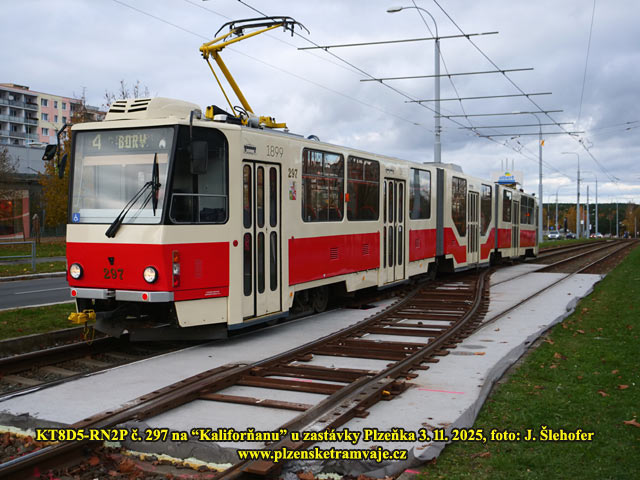 T3R.PLF č. 317+318 se vrací do vozovny přes dokončený oblouk U Jána 3. 8. 2025 T3R.PLF č. 327+328 přejíždí přes kaliforňan u nádraží 3. 8. 2025 Pravidelný provoz tramvají bude obnoven od pondělí 4. 8. 2025, čemuž bude v noci předcházet demontáž povrchové úvraťové výhybky (kaliforňanu) u nádraží. Již během neděle však tudy zatahují některé vozy do vozovny (ve směru z centra mohou přes kaliforňan přejet). Během odpoledne jsou to záložní vozy odstavené v obratištích a večer pak tudy projíždí do vozovny i vozy z linek 1/2 a 4.