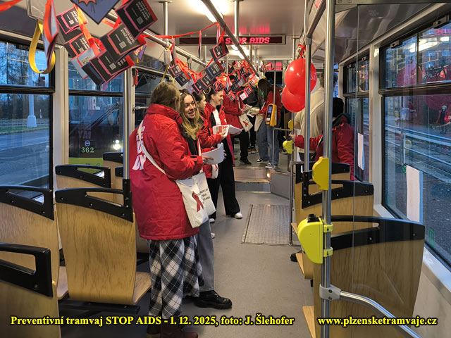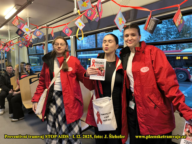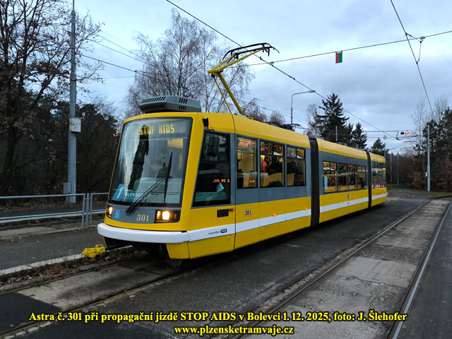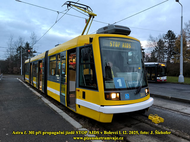 Jízdní řád tramvaje STOP AIDS Podobně jako v předchozích letech, také letos vyjela preventivní tramvaj STOP AIDS připojující se k celorepublikové osvětové kampani. Na zvláštní jízdu 1. 12. 2025 byl nasazen již neprovozovaný vůz Astra č. 301 a tak byl vůz vděčným objektem dopravních fotografů. Osvětová tramvaj nabídla cestujícím nejen netradiční jízdu městem, ale také možnost dozvědět se důležité a ověřené informace o prevenci, testování i léčbě HIV.