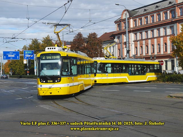 Souprava Vario LF plus č. 336+337 v sadech Pětatřicátníků 14. 10. 2025 Výluková mapka z webu PMDP SU č. 522 na Skvrňanské 14. 10. 2025