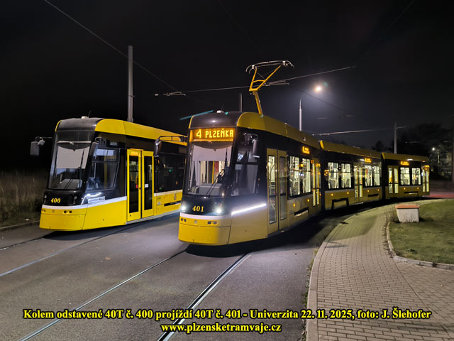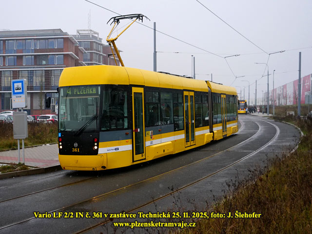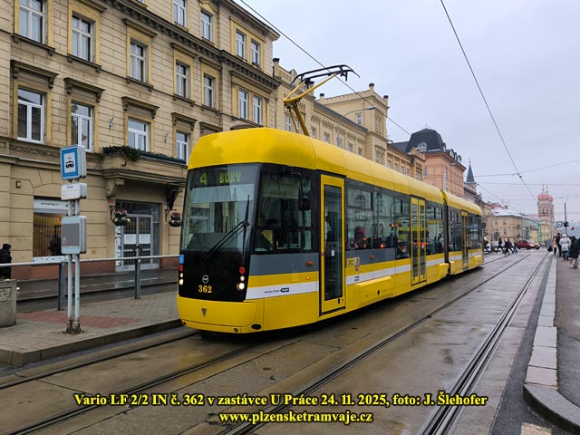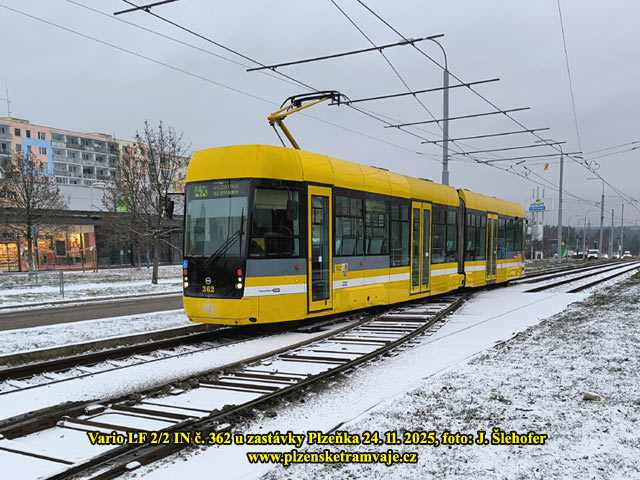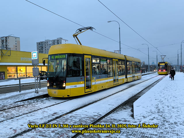 Kolem odstaveného vadného vozu č. 400 projíždí 401 na Univerzitě 23. 11. 2025 V pondělí 24. 11. 2025 ráno mohlo na lince č. 4 zaskočit někoho překvapení. Tím nemyslím drobnou sněhovou nadílku, která se v Plzni objevila, ale vypravení také kratších tramvají VARIO LF2/2 IN, tedy familiárně pojmenovaných Inka. Vozy 361 a 362 se objevily se na dvou šejdrových pořadích (23 a 24).
