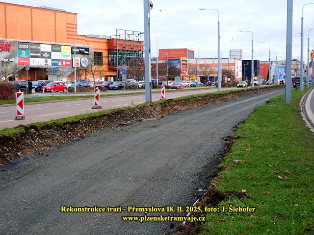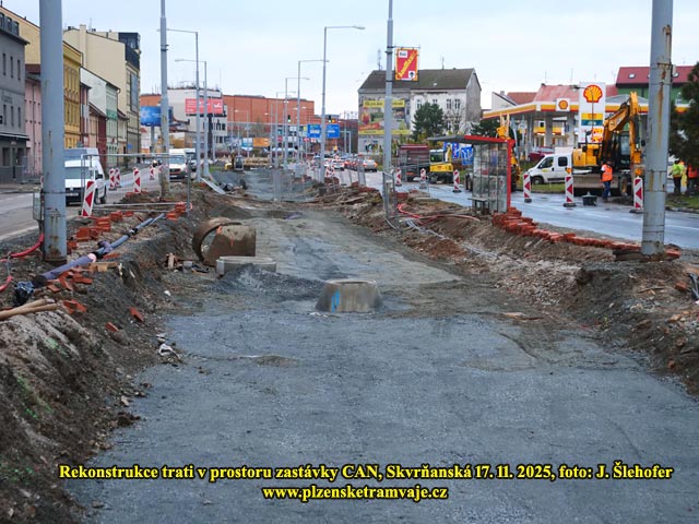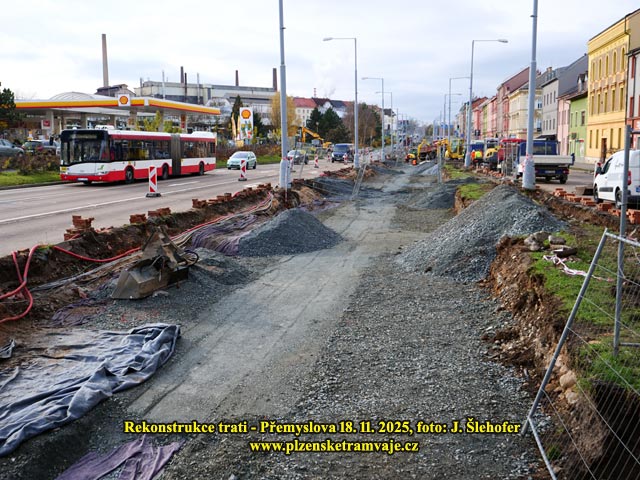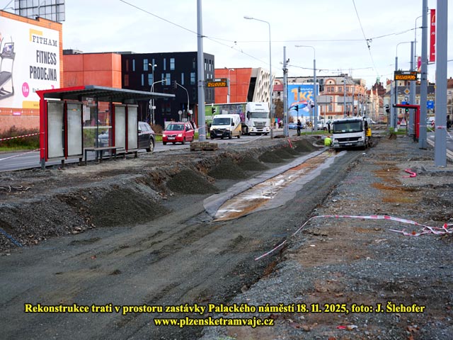 17. 11. 2025 18. 11. 2025 K rozebrání trati došlo celkem rychle a pokračovalo se i s bagrováním podloží. Místy se pracuje na kanalizacích a dalších sítích, objevuje se ale už i nové podloží. V úseku od III. brány, tedy kolem již nedávno zrekonstruované trati, se pracuje také na podélně uložených sítích a dojde zde také k výměně stožárů pro trolejové vedení. Nové patky jsou zde již patrné, stejně jako se objevují již v navazujícím rekonstruovaném úseku.