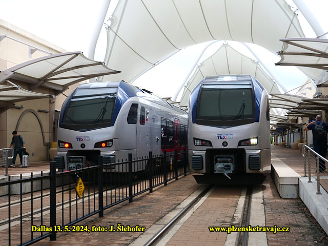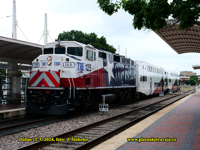 Tak ještě něco málo železničních střípků. Příměstskou železniční dopravu mezi Fort Worth a Dallasem zajišťjí TRE. Jezdí zde dvoupatrové vozy tažené lokomotivou, jak ukazuje první obrázek. Na dalších dvou jsou pak jednotky obsluhující letiště v Dallasu ve směru z Fort Worth. Z Dallasu na letiště zajíždí však také oranžová linka lehké železnice.